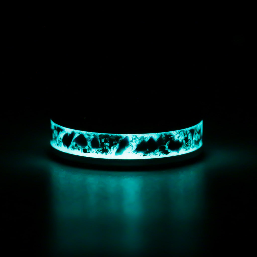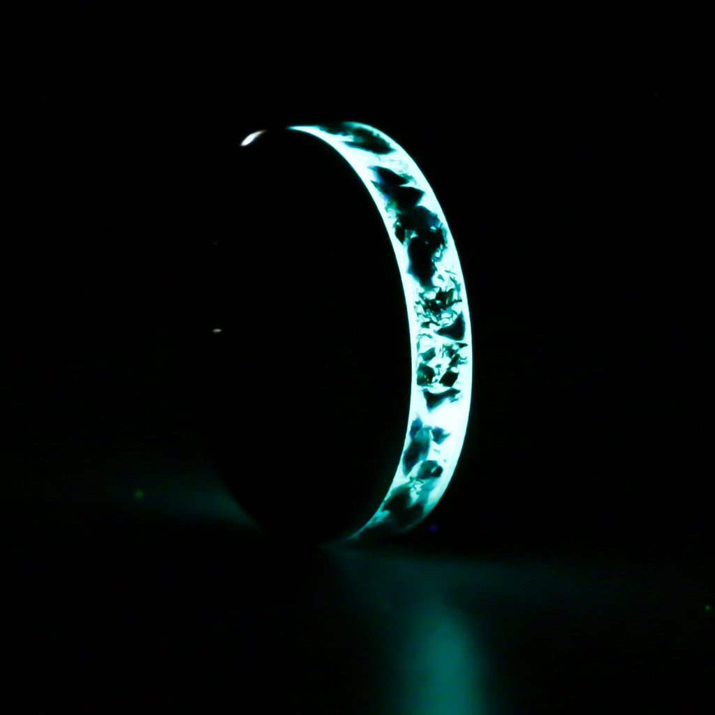 Indulge in the luxurious craftsmanship of the Black Emerald tungsten ring. The custom design features a stunning black emerald opal, infused with meteorite shavings and a captivating aqua glow. Combining elegance and a touch of cosmic beauty, this ring is sure to make a statement.